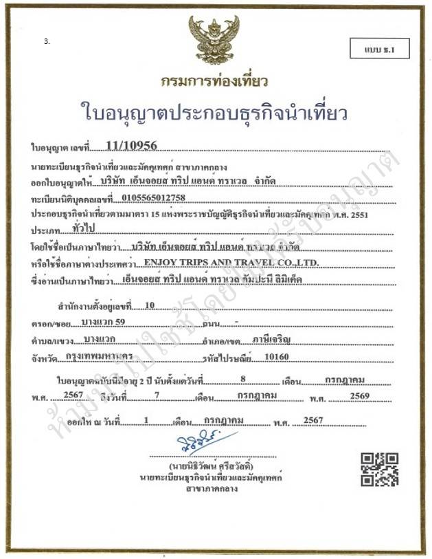 Enjoytrips and Travel อยู่ภายใต้การจดทะเบียนบริษัท เอ็นจอยส์ ทริป แอนด์ ทราเวล จำกัด เลขทะเบียนธุรกิจการค้า 0105565012758 เมื่อวันที่ 20 มกราคม 2565