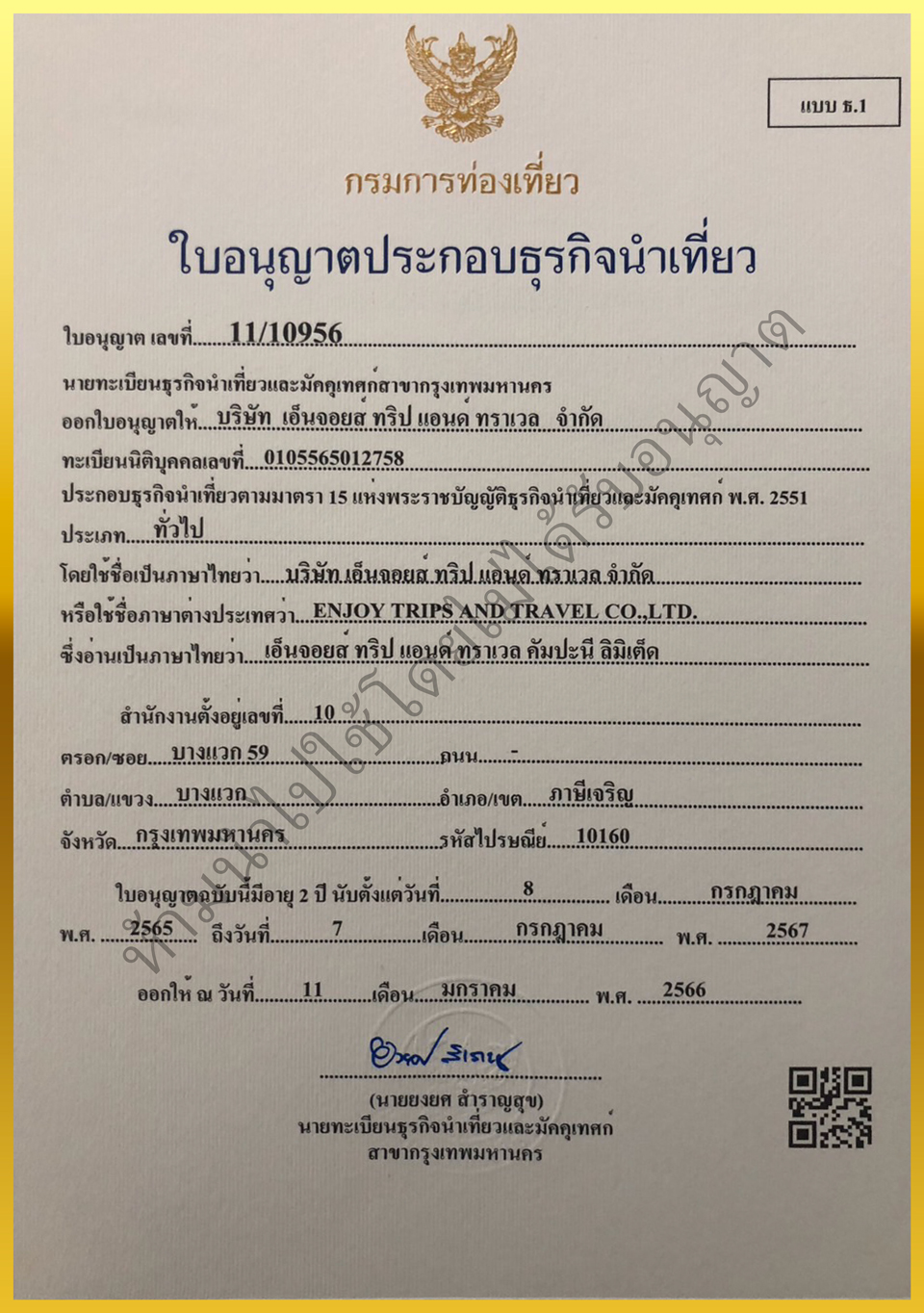 Enjoytrips and Travel 在 2022年1月20日 注册于 Enjoy Trips and travel Co.,Ltd. 有限公司,贸易企业注册号为 0105565012758。我们将提供最好的服务来满足热爱旅游的客户 并满足客户的各种需求与各种形式的休闲旅游。